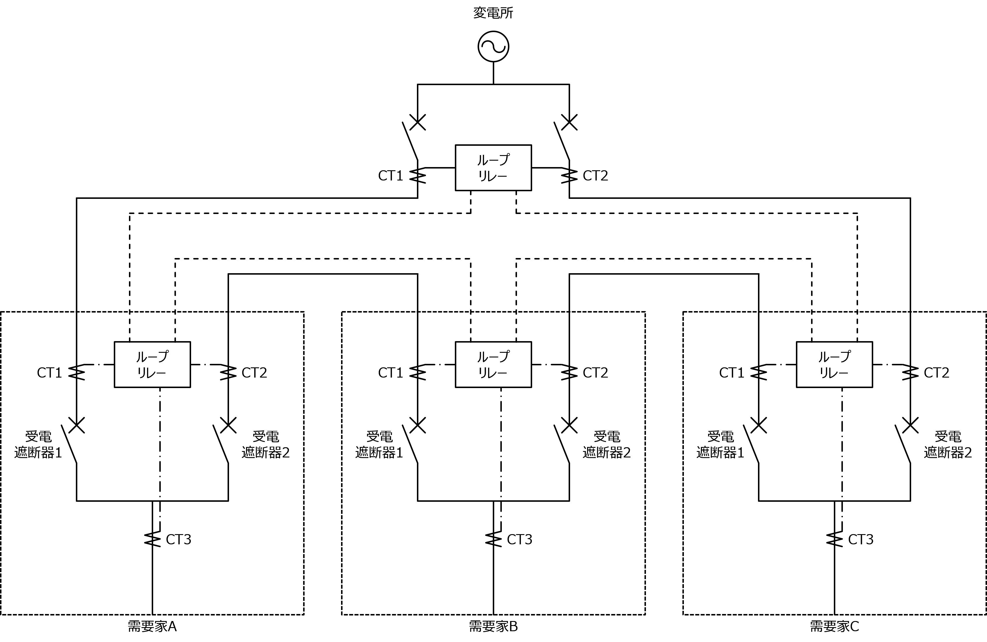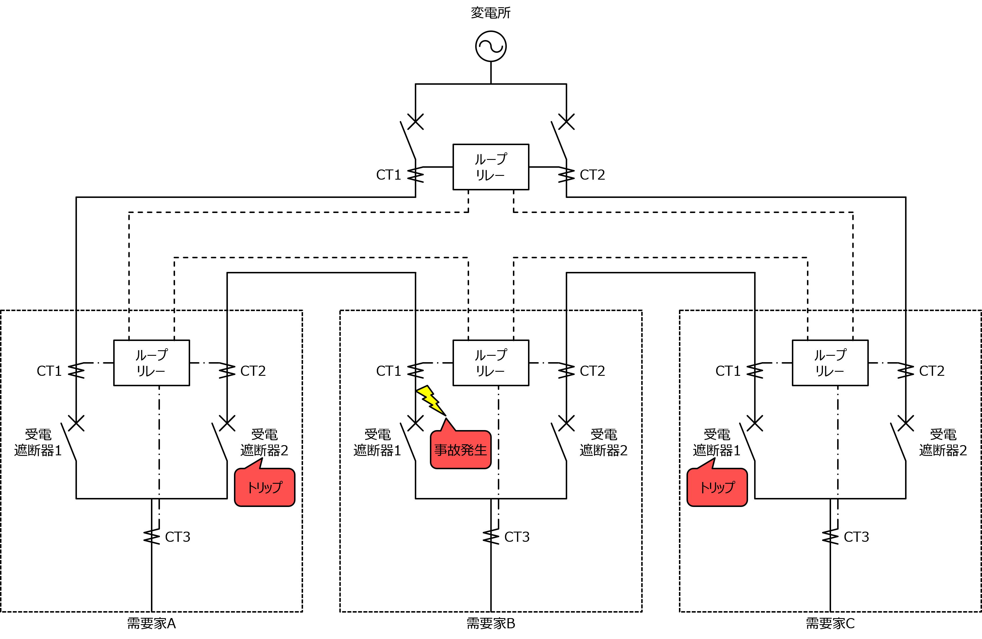 CT1と受電遮断器1の間、もしくはCT2と受電遮断器2の間で事故が発生すると、その需要家の受電遮断器1と2をトリップさせても事故除去はできません。そのため、CT3で受電遮断器の1次側事故か2次側事故かを区別して、受電遮断器1次側事故の場合はループリレー内の母線保護リレー(ブスプロリレー)が動作し、事故が発生した需要家の両端にある需要家(相手端)の受電遮断器がトリップします。