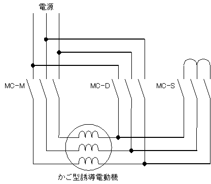 図2はかご型誘導電動機をスターデルタ始動する回路図です。始動するときはMC-MとMC-Sを閉じて、電動機の巻線をスター結線にします。このとき各巻線には線間電圧の1/√3が印加されています。この状態で加速し一定時間経過後、MC-Sを開いてMC-Dを閉じます。すると巻線がデルタ結線になり、各巻線に全電圧を印加します。
