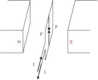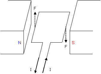 磁石のN極とS極の間に電線で輪を作り、電流Iを流すとフレミング左手の法則によって力Fが電線に加わります。図1の場合、この力Fによって電線の輪は右回り(時計方向)に回転します。