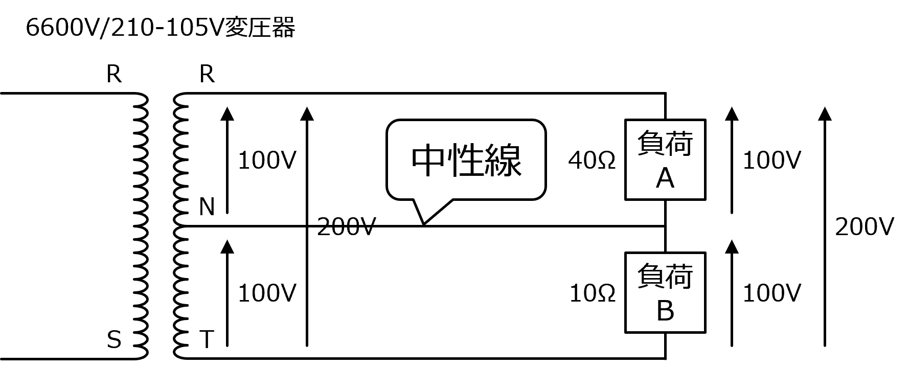 単相3線式は、R相、N相、T相の3本の配線で電気を送る方式です。平常時は、下図のように負荷Aと負荷Bには100Vがかかっています。